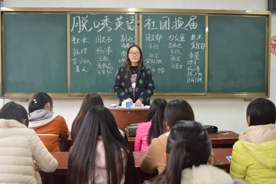 11月18日中午,云顶yd2223线路检测英语脱口秀社团在人文楼104教室进行2015-2016学年换届,社长魏晓莉携本社全体成员参与,大会由副社长夏天主持。