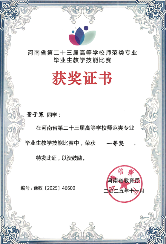10月24-26日,第二十三届河南省师范生教学技能比赛在郑州师范学院举行。公司2022级英语5班陈子田同学荣获中学组(英语学科)一等奖,指导教师:曹悦。2022级英语1班董子寒同学荣获小学组(英语学科)一等奖,指导教师:马斐。2022级英语3班苗润同学荣获小学组(英语学科)二等奖,指导教师:杨慧芳。