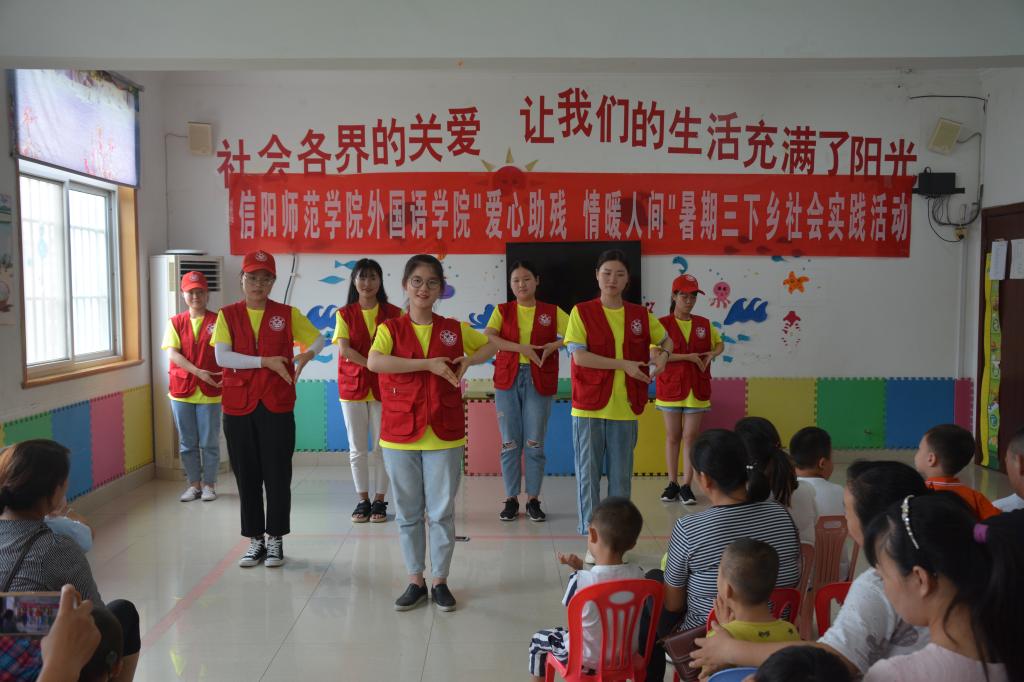7月10日上午,服务队赴信阳市残疾人联合会开展残障青少年成长和受教育情况调研,了解残障青少年成长环境、教育环境及其面临的困难等。调研结束后,信阳市残疾人联合会工作人员带领部分听力障碍和智力障碍儿童为志愿服务队带来社会主义核心价值观二十四字背诵、古诗词背诵等表演,志愿服务队成员通过手语操、儿歌、舞蹈等节目与他们互动,现场气氛温馨融洽。