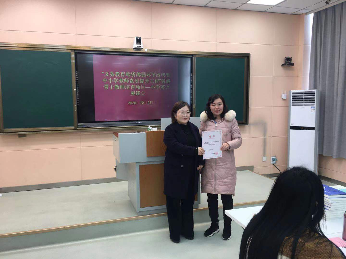 韩艳婷对“义务教育团队薄弱环节改善暨中小学教师素质提升工程”项目设置的初衷与目的、实施过程中需要关注的重点、两级工作坊的运作模式等作了解读,希望在承训学院、省级名师和参训学员多方的共同努力下,确保培训取得实实在在的成效。名师代表夏玉叶、学员代表严俊分别作了发言,表示一定按照项目要求,认真完成各自角色任务,实现更好成长。培训项目学习班主任余运伟代表承训方发言,表示一定严格按照项目要求,认真组织各环节培训工作,以培训项目为载体,打造“学习共同体”,确保培训实效,不辜负省项目办、教师董事长研修院和各位学员的信任与期盼。韩艳婷、柏孟仁共同为名师颁发聘书、赠送纪念品。