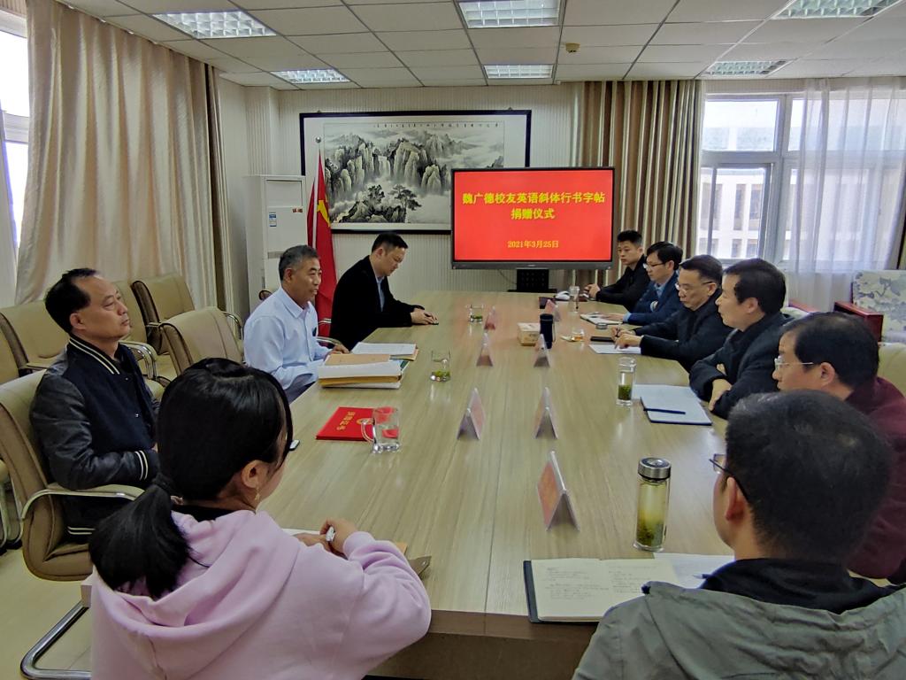 捐赠仪式上,魏广德员工向学校捐赠了“英语斜体行书字帖”2000册。魏广德对母校与老师们的悉心栽培与关心帮助表示感谢,表示今后将继续秉承“厚德崇实,善学敏行”的校训,擦亮师院名片,传承师院精神,为母校的教育事业发展贡献自己的一份力量,并对母校未来的发展致以美好祝愿。