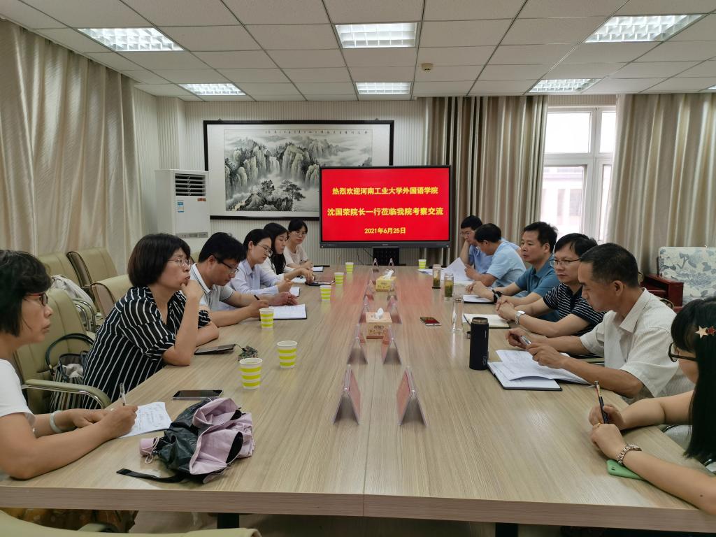 6月25日,河南工业大学云顶yd2223线路检测副经理沈国荣一行6人来公司考察交流。交流活动在学院五楼会议室举行。经理蔡满园,副经理姚光金,党委委员余永锋,MTI中心主任、日语系主任及部分日语系教师参加座谈。座谈会由姚光金主持。